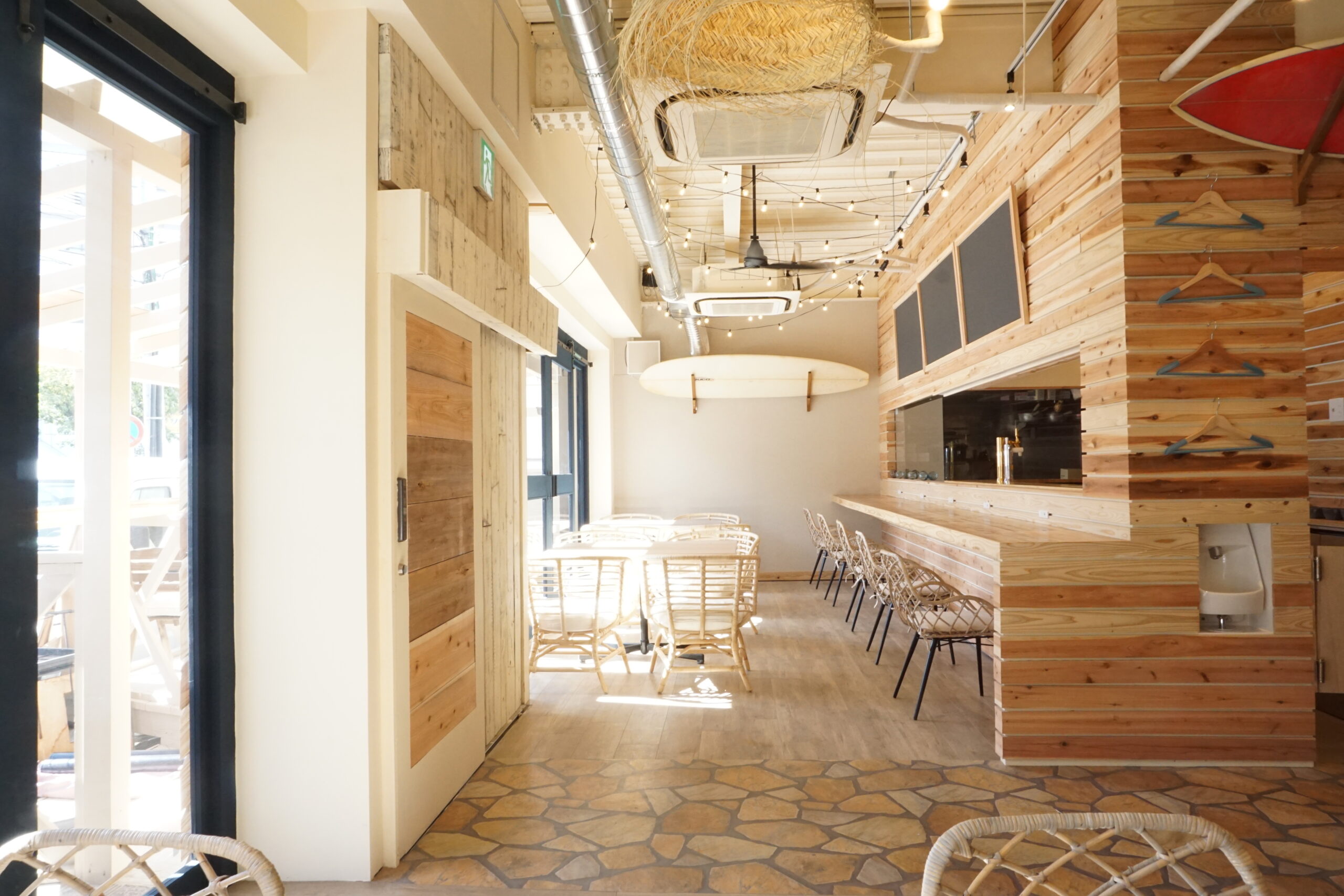 コストパフォーマンスとクオリティを意識し、国産杉下地材の「ぬき」を壁面に貼って板目の美しさを表現しました。杉本来の柔らかさや温もりを感じていただくため、カウンターにも杉の野地板を使用しています。