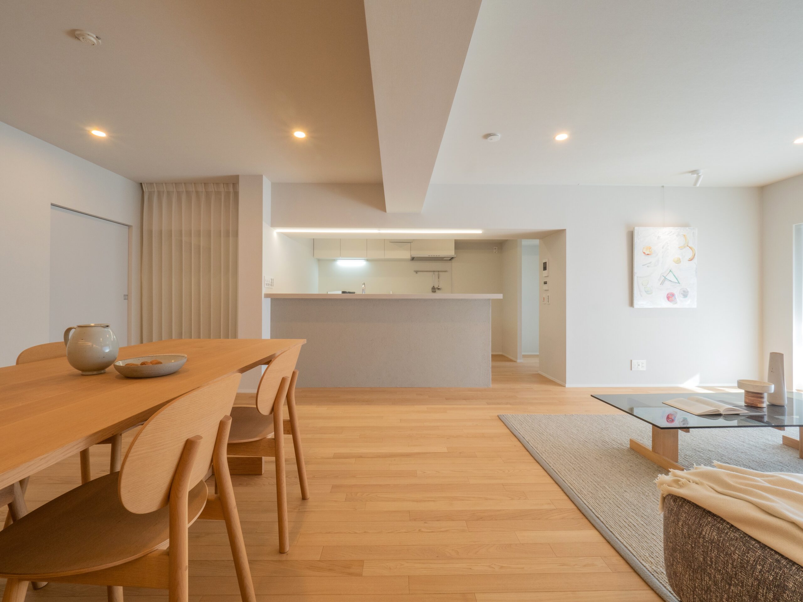 依頼に合わせたリビングへのアクセントウォールやふかし壁の設置、居室までのアプローチに設けたギャラリースペースのニッチ造作における光量とピン角を意識した造作がこだわりのポイントです。特に、間接照明やライン照明の表現に注意して施工しました。