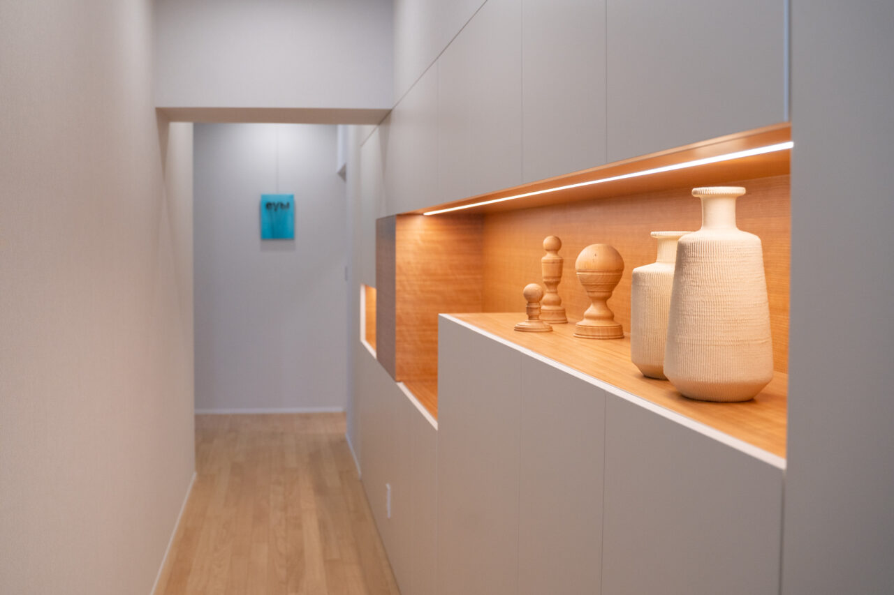 依頼に合わせたリビングへのアクセントウォールやふかし壁の設置、居室までのアプローチに設けたギャラリースペースのニッチ造作における光量とピン角を意識した造作がこだわりのポイントです。特に、間接照明やライン照明の表現に注意して施工しました。