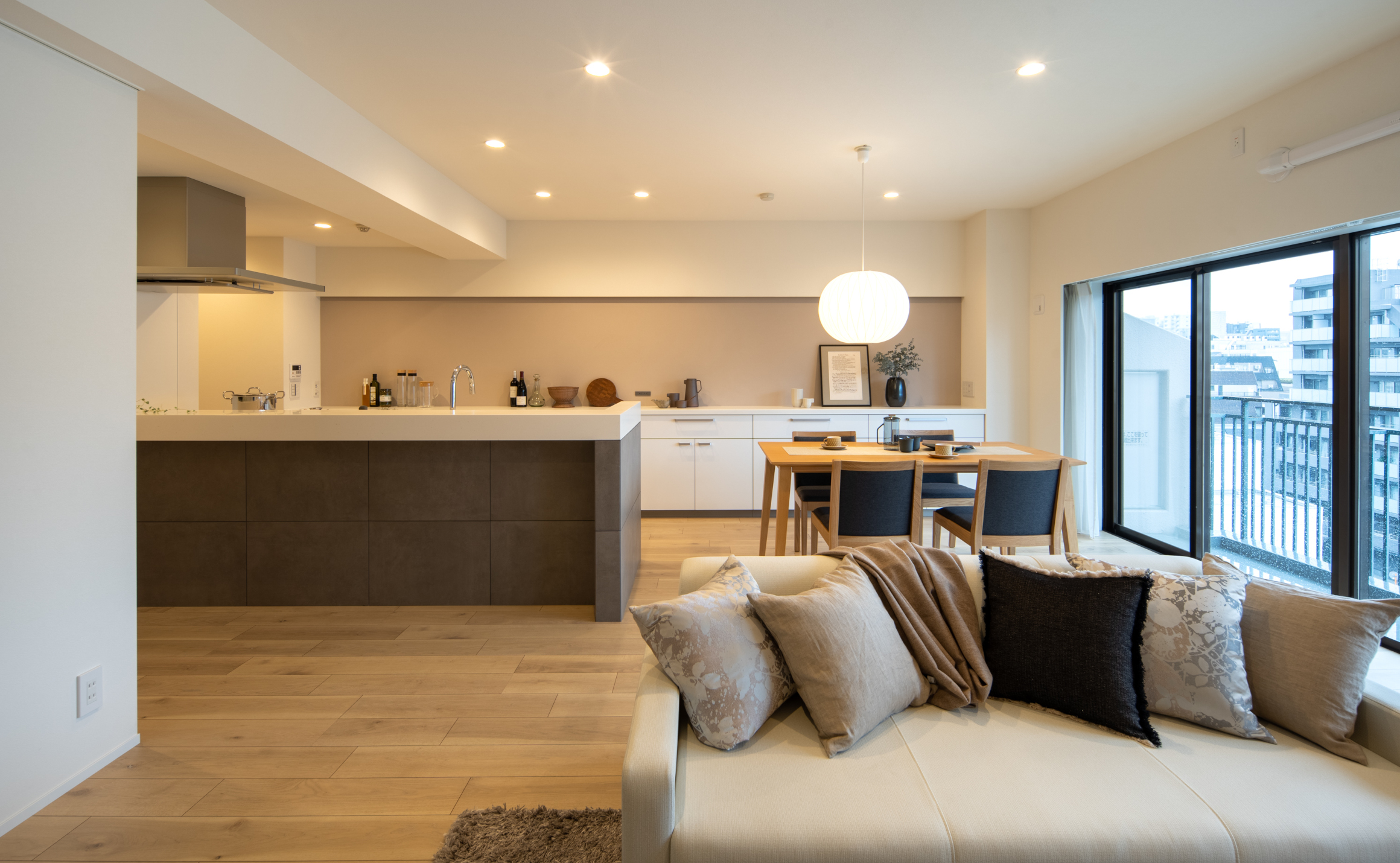 「キッチンを中心としたファミリー向け住宅」のご依頼をいただき、玄関たたき、框、廊下と段差を介して直線で結ぶ玄関からリビングにかけての床タイル目地の割付精度にこだわって施工を行いました。全体の品質に影響を及ぼすため、特にキッチン背面のタイル貼りや照明付き棚の直線には細心の注意を払っています。