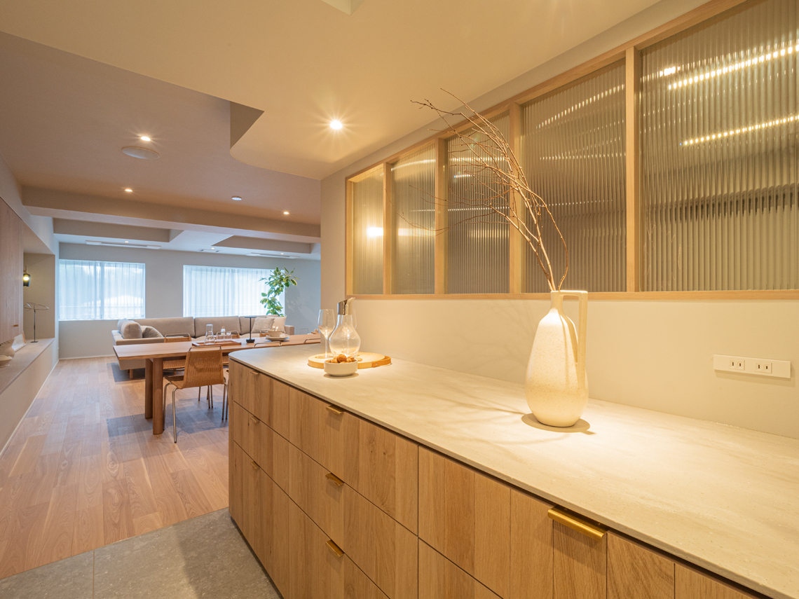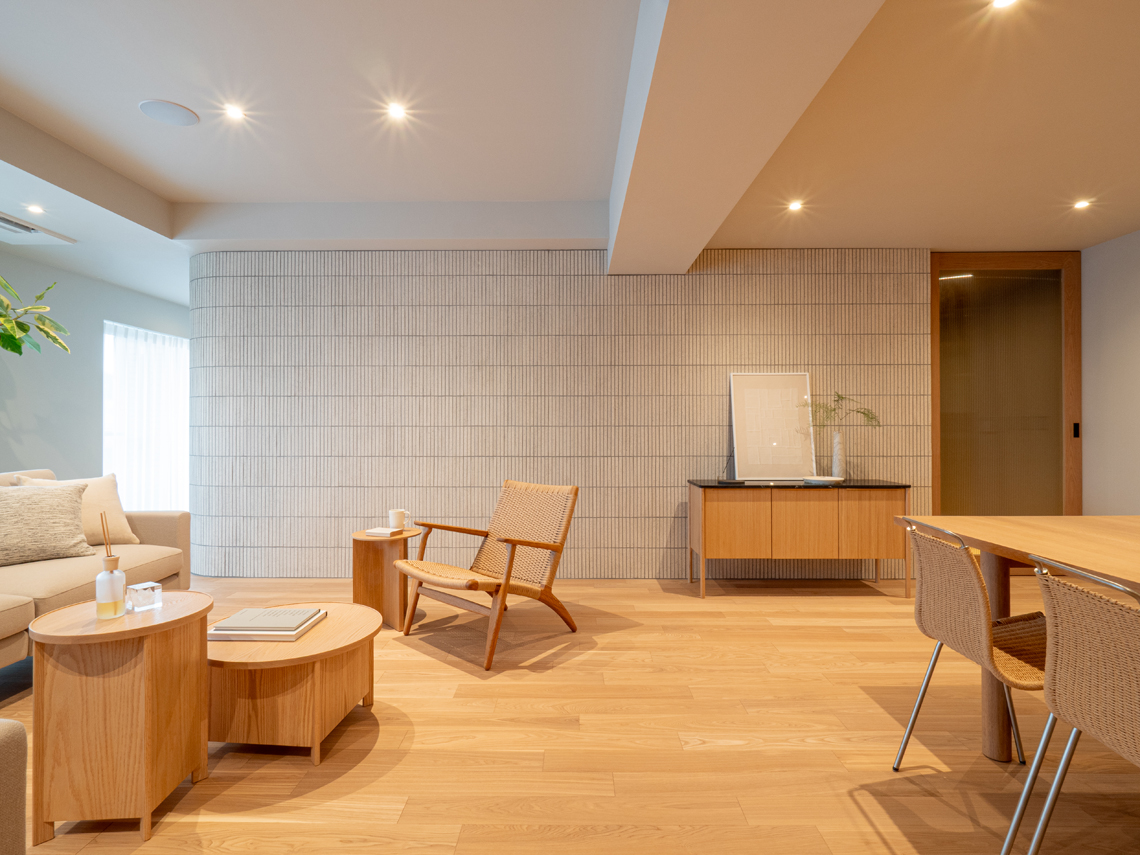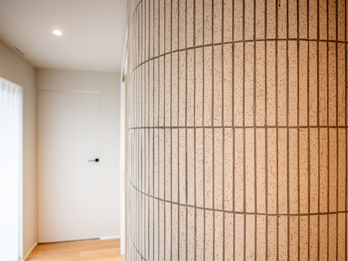 木やタイルを曲線で仕上げることで、シンプルながらも存在感のある空間に仕上がりました。柔らかな印象に包まれた室内には、造作の室内窓がアクセントとしてほどよい個性を添えています。