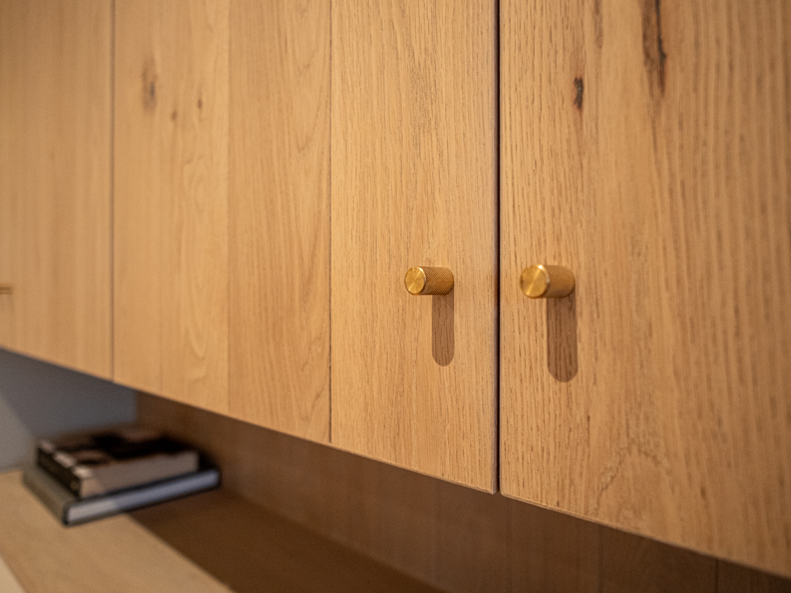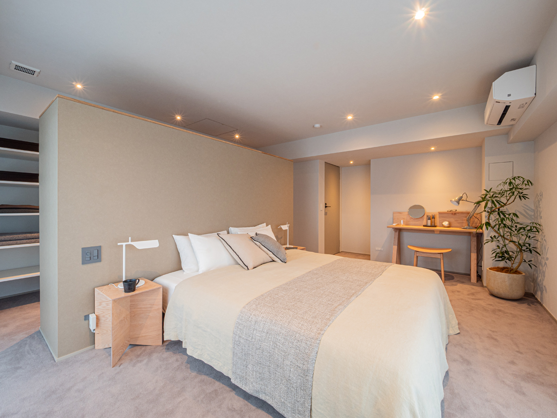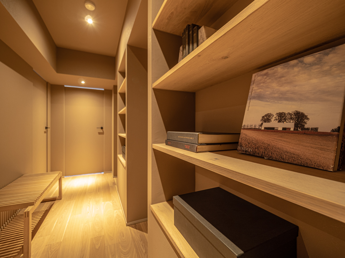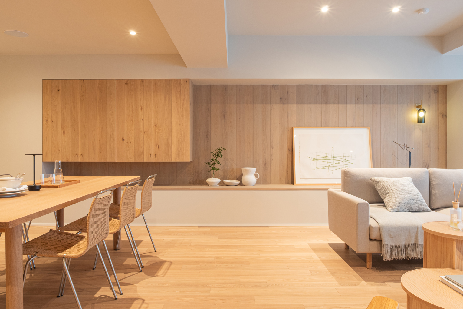 木やタイルを曲線で仕上げることで、シンプルながらも存在感のある空間に仕上がりました。柔らかな印象に包まれた室内には、造作の室内窓がアクセントとしてほどよい個性を添えています。