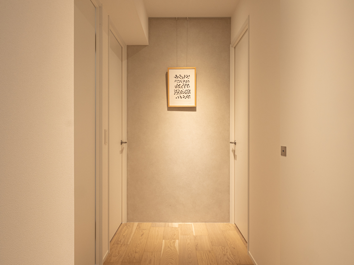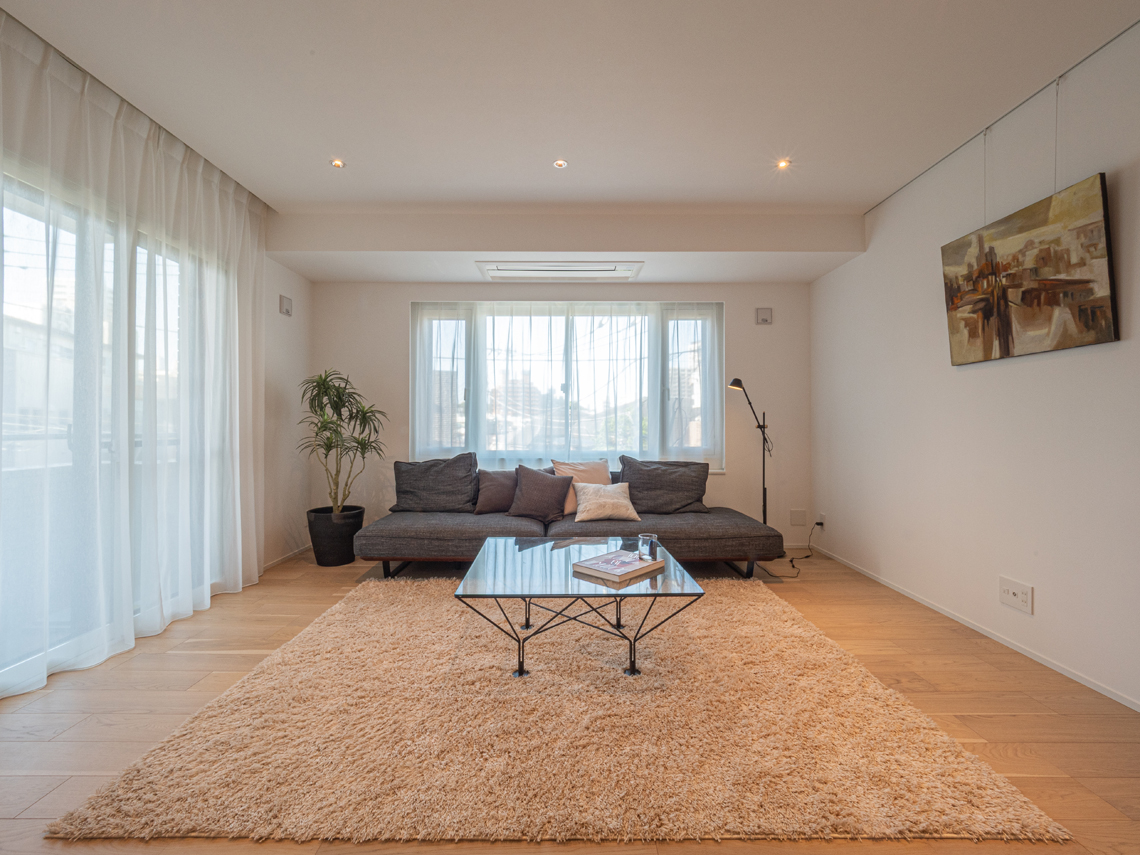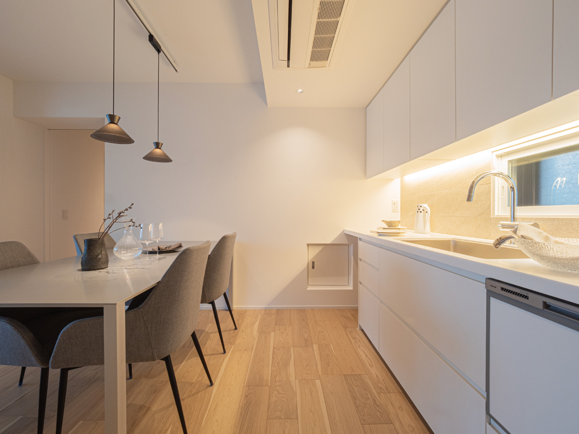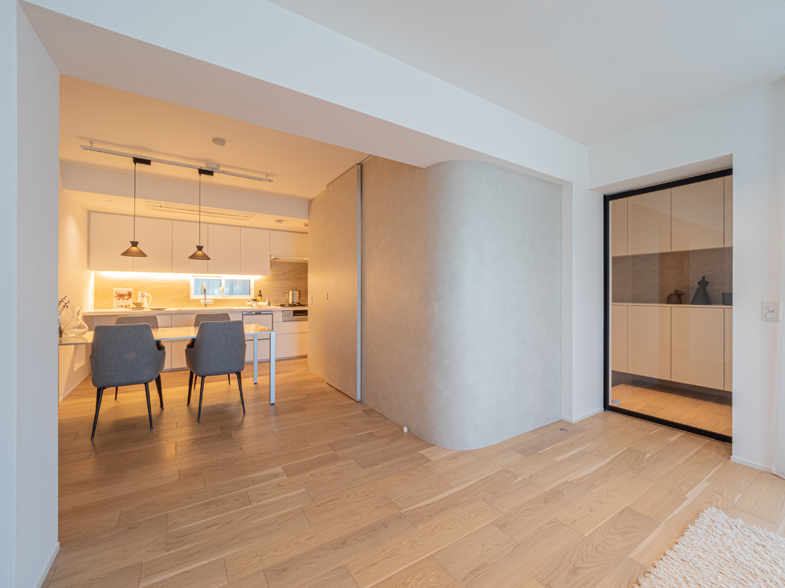 色味を抑えた落ち着いた空間に、曲線を用いたグレーの壁を設えた事で洗練された雰囲気に仕上がりました。また、断熱性能をZEH水準の省エネ住宅に仕上げた事でデザイン性と快適性を両立しております。